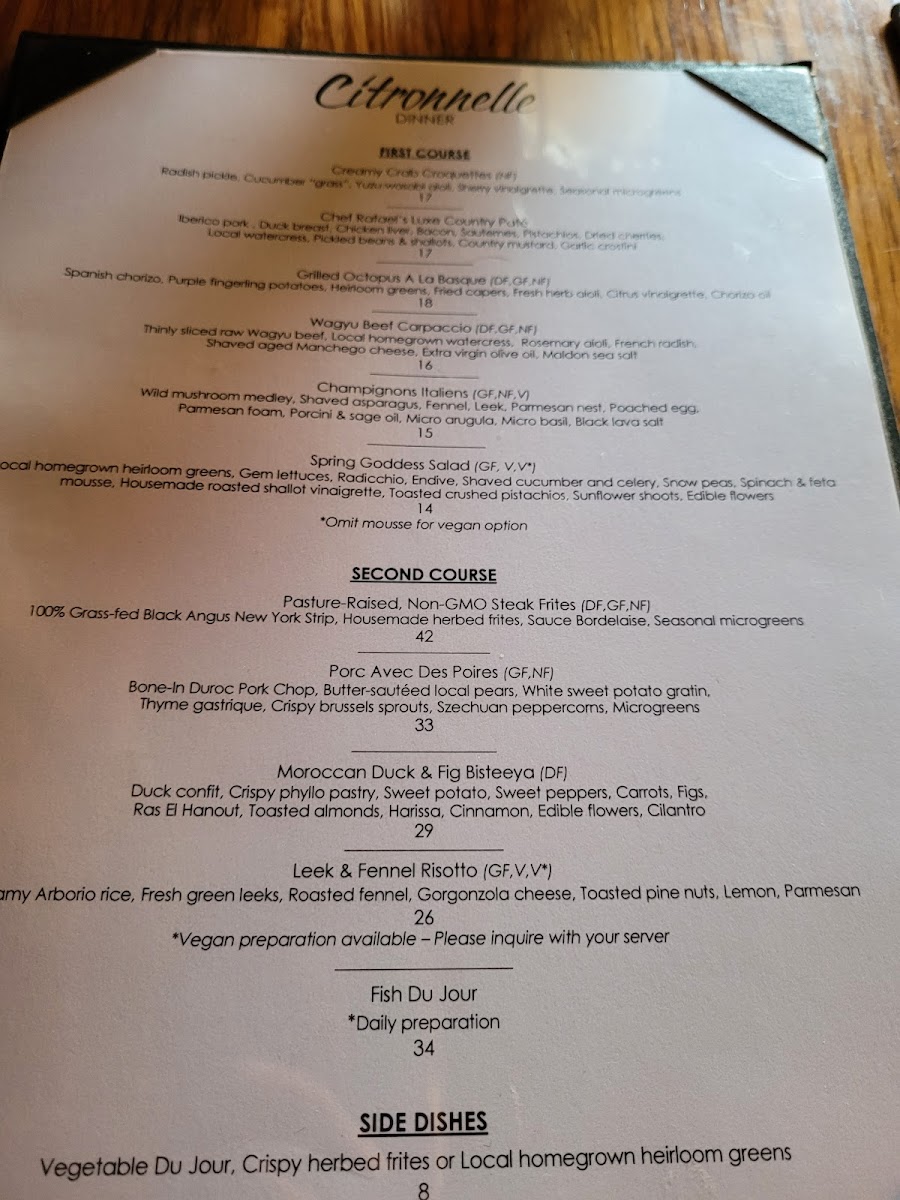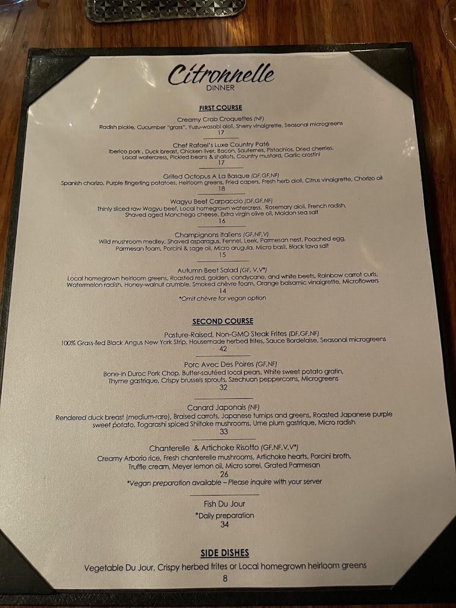 Welcome to Citronnelle, a hidden gem nestled in Lancaster, PA. This charming French restaurant boasts an exquisite menu that tantalizes the senses. Start your culinary journey with irresistible appetizers like the flavorful crab croquettes or rich wagyu carpaccio. The entrees impress with selections such as the duck bisteeya, which offers a delightful twist reminiscent of curry, and perfectly cooked New York strip steak.