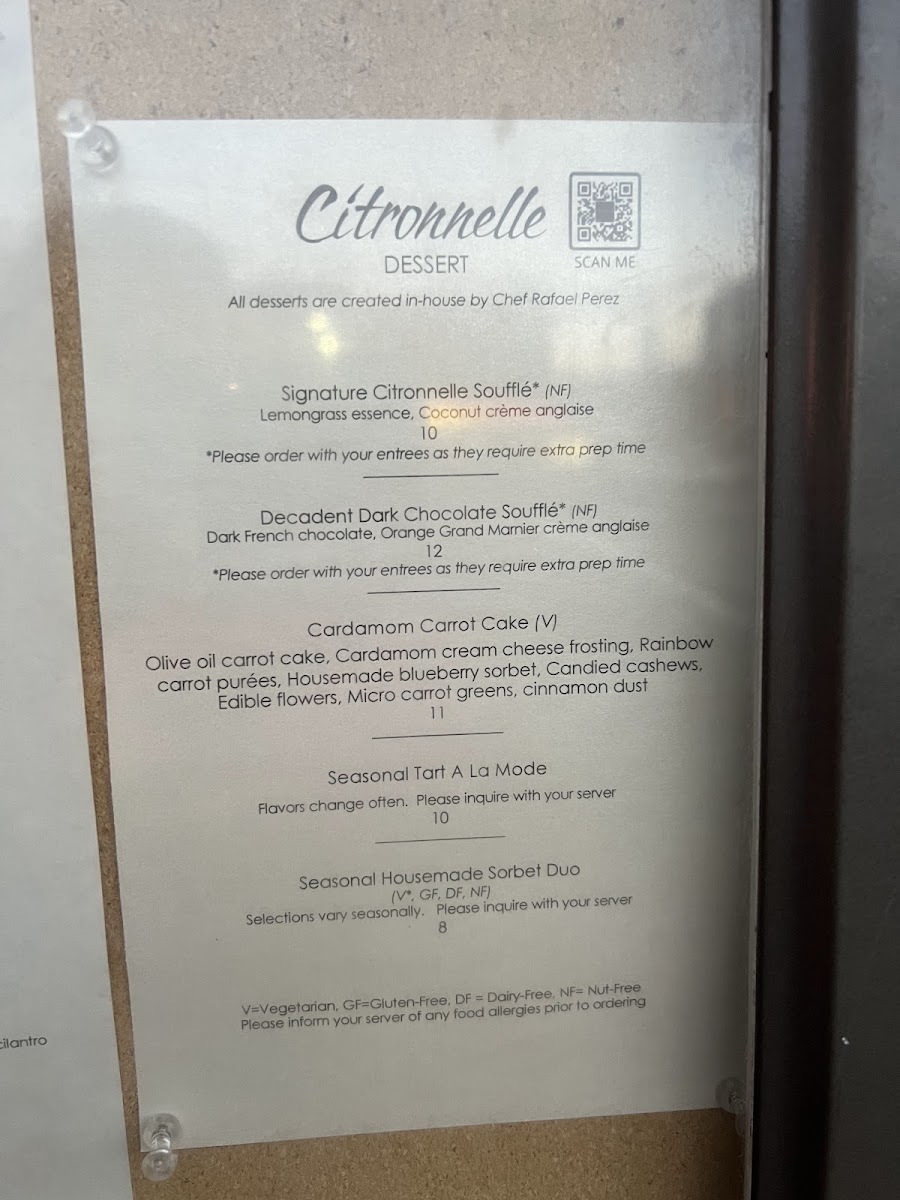 For dessert, Citronnelle shines with standout offerings. The Signature Citronnelle Souffle, infused with lemongrass essence and complemented by coconut crème anglaise, delights palates for just $10.00. Meanwhile, the Decadent Dark Chocolate Souffle, paired with orange grand marnier crème anglaise at $12.00, is a chocolate lover's dream. The atmosphere is inviting, making it perfect for special occasions, and the BYOB option adds a personal touch to your dining experience.